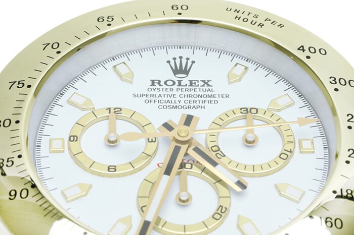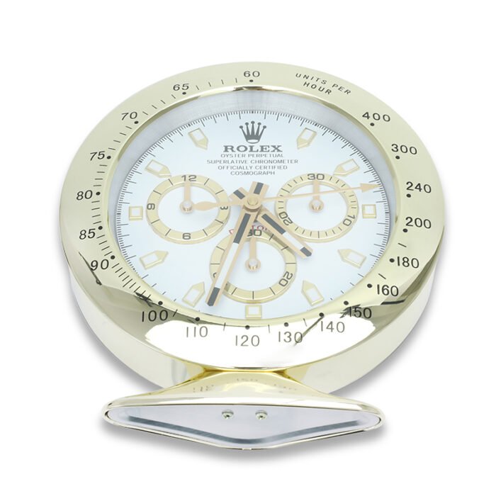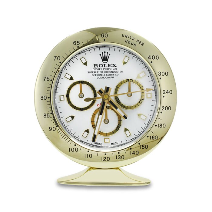 Bring timeless sophistication to your space with the Daytona, Gold and White Desk Clock — a luxury Rolex-style desk clock that redefines classic elegance. Inspired by the iconic Rolex Daytona chronograph, this premium table clock is designed for watch enthusiasts, collectors, and professionals who demand refined decor and precision timekeeping.