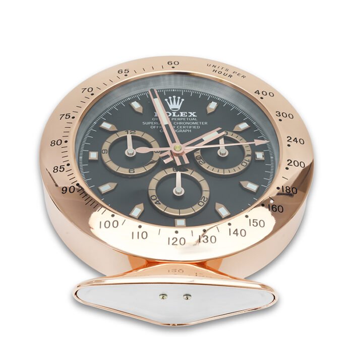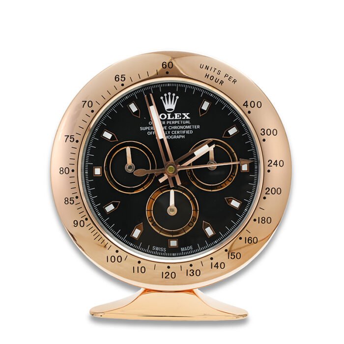 This Rolex desk clock replica brings the prestige of horology into your office, study, or boutique. Its Rose gold-and-Black color combination complements luxury interiors, making it the perfect executive desk clock, showroom accessory, or upscale gift.